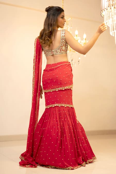 Red pre-draped saree featuring cutdana and mirrorwork embellishments with a mermaid silhouette. Accompanied by a sleeveless padded blouse with a V-neckline.
