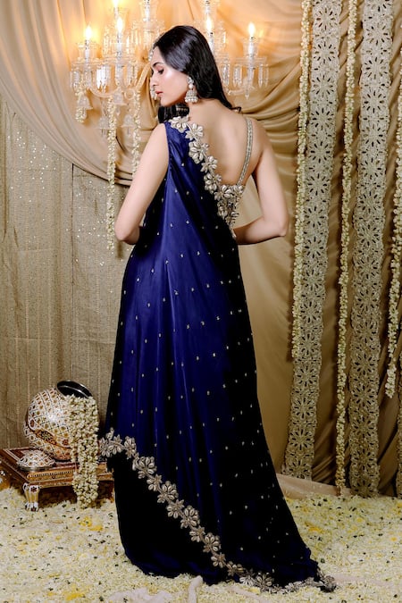 Blue Crepe Mirrors, Embroidery Square Neck And Cowrie Embellished Cape & Pant Set