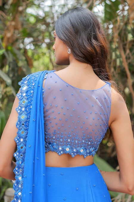 Blue pre-draped saree featuring floral, mirror, and cutdana hand embroidery. Includes a padded blouse with an attached lining and cancan.