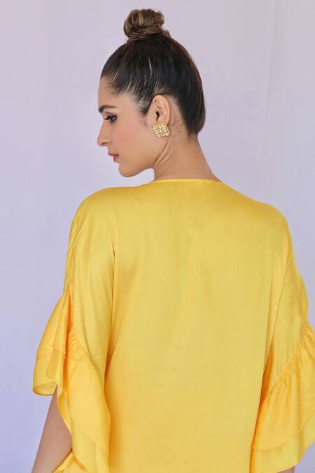 Yellow kurta featuring ruffled three fourth sleeves, V neck, and cowrie shell & mirror embroidery on the neckline. Paired with a matching dhoti pant for a complete look.