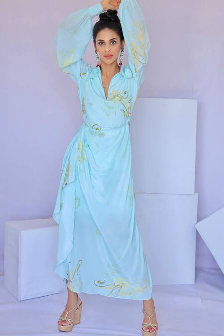 Blue maxi dress featuring a wrap style with paisley garden print and wide collar neckline