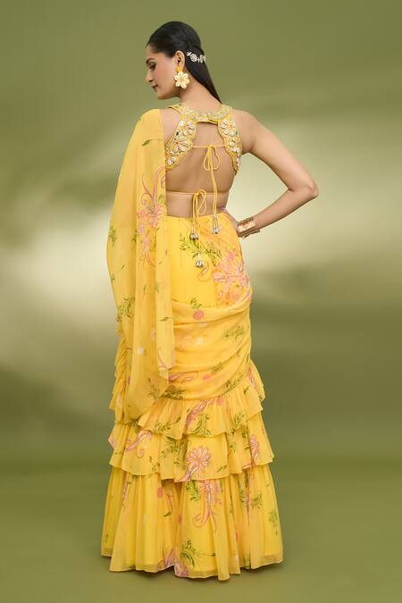 Yellow ruffle pre-draped saree featuring paisley print and attached cancan. Paired with a padded blouse adorned with mirror and cowrie hand embroidery.