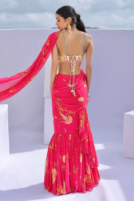 Pink pre-draped ruffle saree featuring paisley printed base and embellished blouse. Blouse includes mirrorwork and cowrie shell details, with a halter neck design.