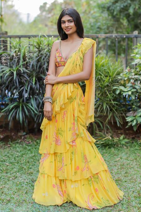 Yellow ruffle pre-draped saree featuring floral print and an attached cancan. Accompanied by a padded blouse adorned with mirror and cowrie hand embroidery.