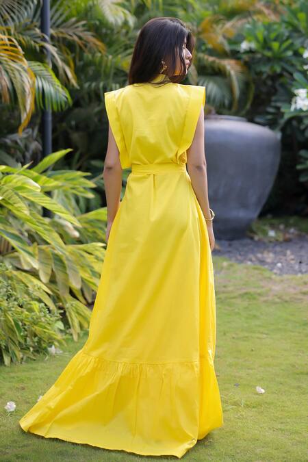 Yellow dress made from rayon featuring a V-neck and a tie-up waist