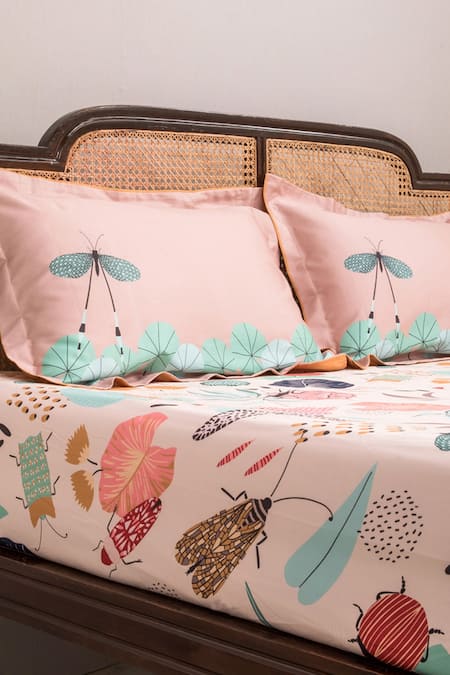 Pink & multi color cotton bedsheet with sateen finish, all over contrast flora & fauna pattern. Comes with matching monochrome set of 4 pillow cases.