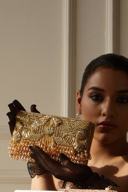 Gold suede clutch featuring intricate bead and crystal embellishments