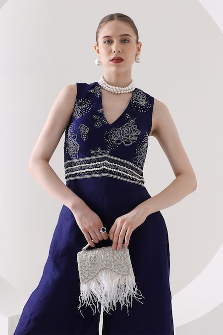 Silver handbag featuring cutdana embroidered floral motifs and pearl embellishments