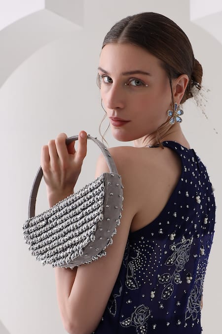 Silver handbag featuring all-over crystal tassels and a semi-circular embellished handle