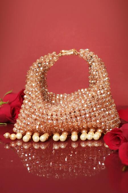 Gold boat-shaped handbag encrusted with dazzling crystals and elegant pearl drops