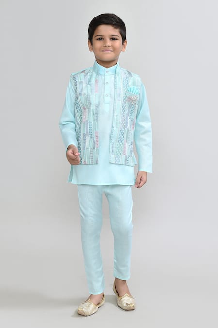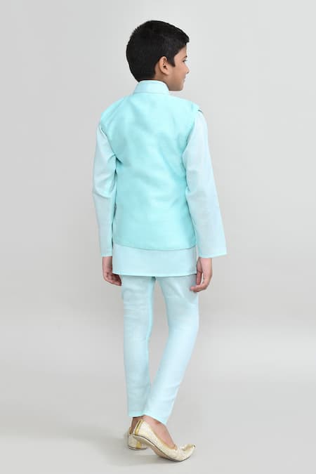 Petite Pomme_Mint Cotton Embroidery Designer Green Kurta Pyjama Waistcoat Set _Online_at_Aza_Fashions