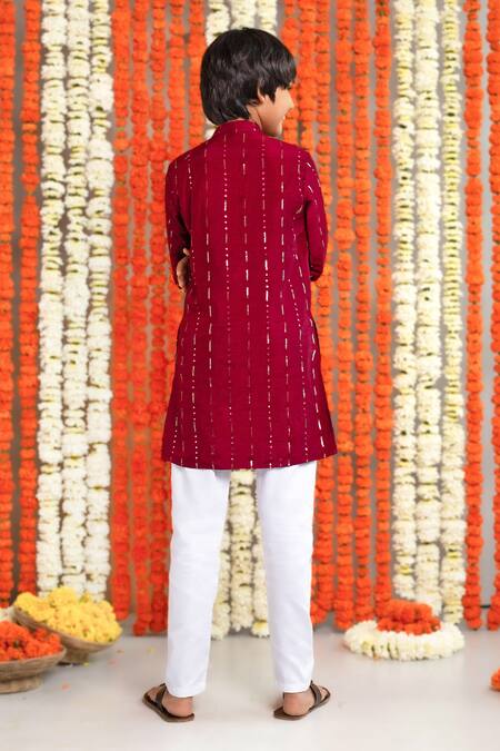 Maroon silk kurta featuring three quarter sleeves, Mandarin collar, and embellished with abhla, sequins, thread, and mirror patch embroidery. Paired with contrast white pyjama with an elastic waistband.