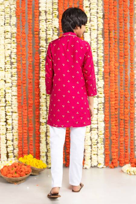 Pink kurta featuring a floral print with gota trim detailing. Paired with a contrast white pyjama pant with an elastic waistband.