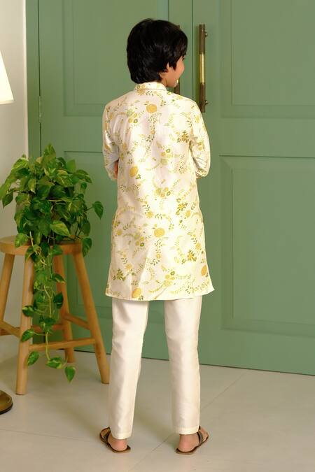 Ivory kurta featuring a mandarin collar, three quarter sleeves, and floral print. Paired with coordinating pyjama featuring an elastic waistband.