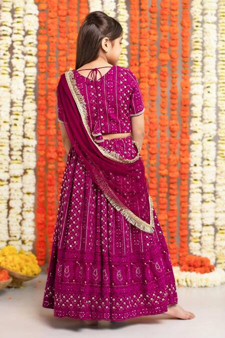 Purple sequin and thread embroidered lehenga featuring an elastic waistband at the back. Paired with a coordinating top with criss-cross tie-up detailing and a kiran lace border dupatta.