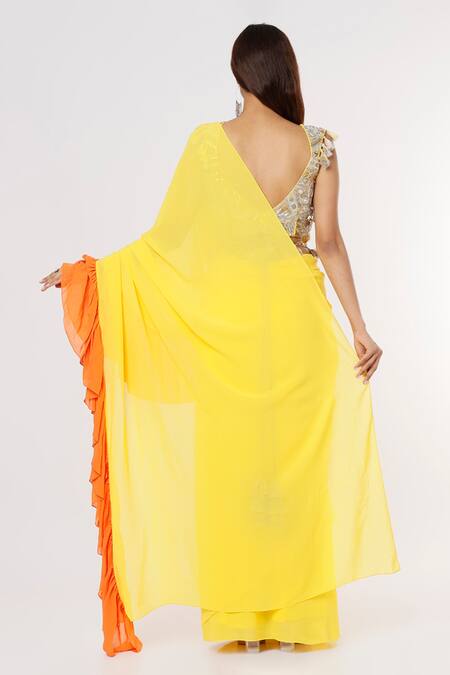 Yellow saree in a georgette base with orange frill border. Comes with sleeveless embroidered blouse.