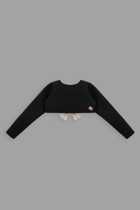 Black scuba shrug with gold frill details & shimmer band embellishment.