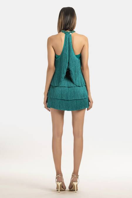 Green top featuring a halter neck, stone and fringe tassels embellishments, and a back slit detail