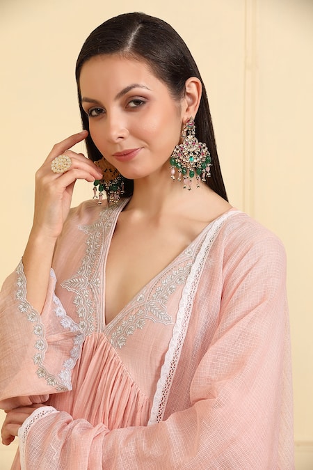 Buy_Neha Khullar_Pink Chanderi Silk, Cotton, Muslin Embroidery, Lace Front Gather Kurta Pant Set _at_Aza_Fashions