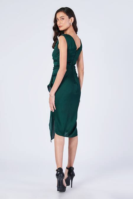 Emerald green twisted drape dress featuring embroidered details and metallic spike embellishments on the shoulders