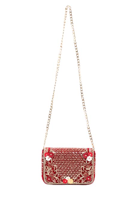 Maroon velvet clutch featuring box shape with envelope flap and floral embroidery