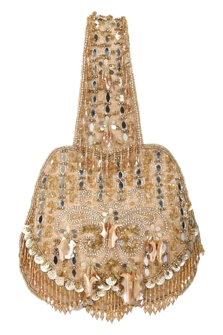 Gold potli bag featuring intricate zari, cut dana, bead, stone, and mirror hand embroidery