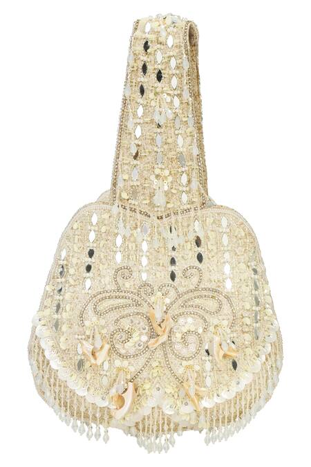 White potli bag crafted from jute silk featuring intricate crystal, mirror, and sequin embroidery
