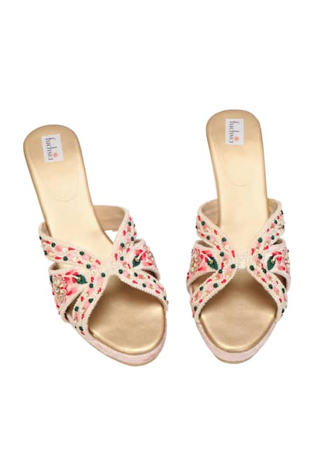 Pink wedges featuring pearl, resham, floral embellishments and cutout detailing