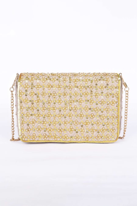 Gold clutch featuring intricate sequin embellishments and a detachable sling