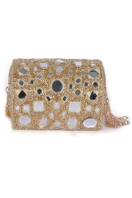 Gold velvet clutch embellished with intricate mirror work and bead detailing