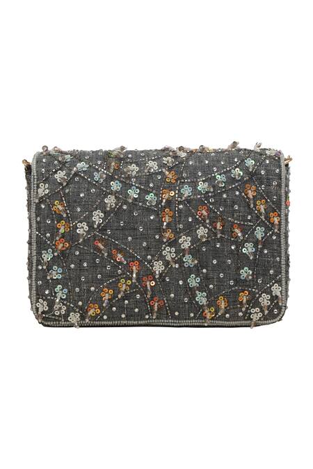Floral embroidery with sequin embellishments, Gold chain strap for versatility, Flap over closure for secure fastening