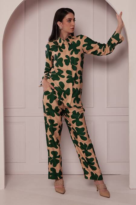 Beige shirt featuring a green floral print with a collared neck and full sleeves. Paired with matching relaxed fit pants in the same print design.