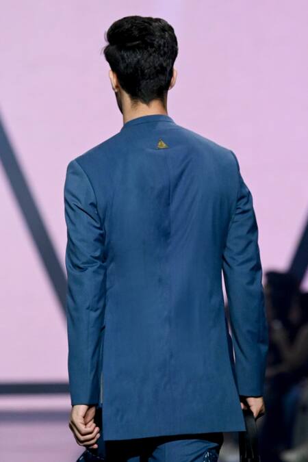 Blue full sleeve bandhgala featuring a band collar and a flap pocket on the chest. Paired with tonal pants crafted from terry rayon with a soft cotton lining.