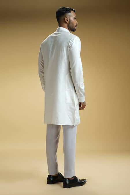 Off white full sleeve kurta featuring a stand collared neckline and half button placket. Paired with a light grey trouser for a complete look.