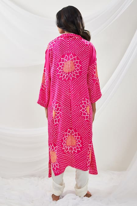 Pink long overlay in gajji silk hand tie dyed bandhani pattern. Paired with bustier & tulip dhoti pant.
