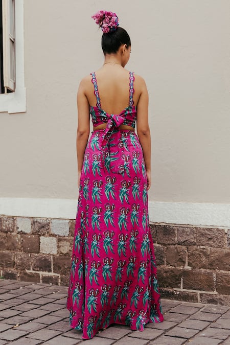Buy_Jodi_Pink Satin Silk Bead Work, Block Print, Sequins Gajner Draped Skirt_Online_at_Aza_Fashions