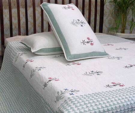 Grey, green cotton quilted bedspread with floral hand block print. Comes with matching pillow covers.