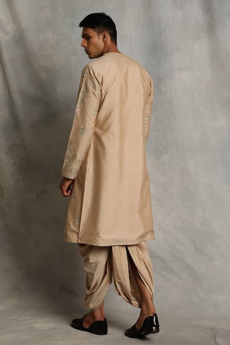 Gold angrakha with floral embroidered sleeves & side tie-up. Paired with embroidered kurta & dhoti pant.