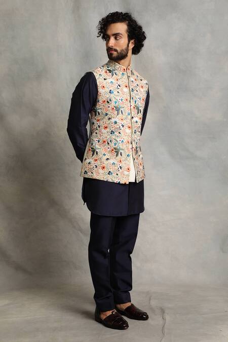 Off white bundi with floral embroidered motifs. Paired with kurta & churidar.