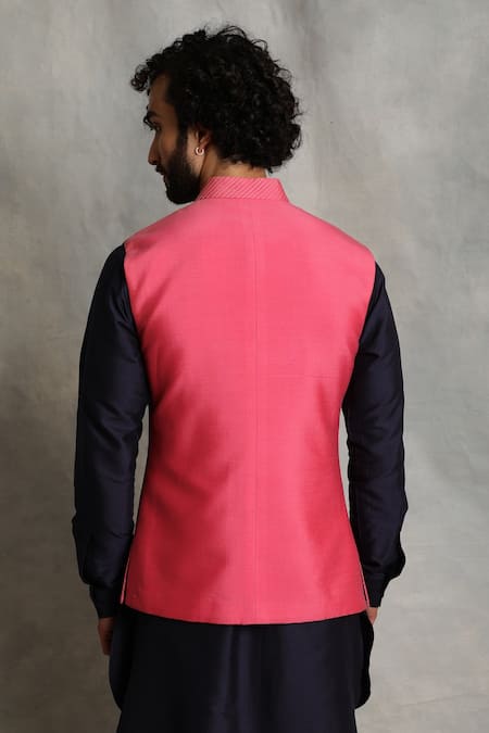 Pink overlap bundi with embroidered stripes & patch pocket. Paired with kurta & churidar.