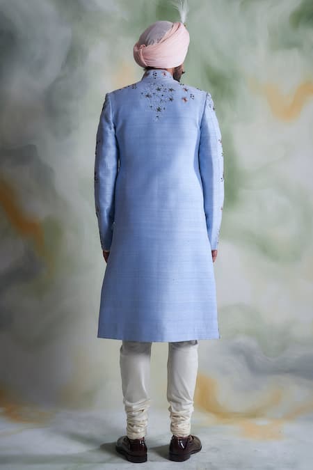 Sky blue sherwani with floral embroidery & mandarin collar. Paired with kurta & pyjama.