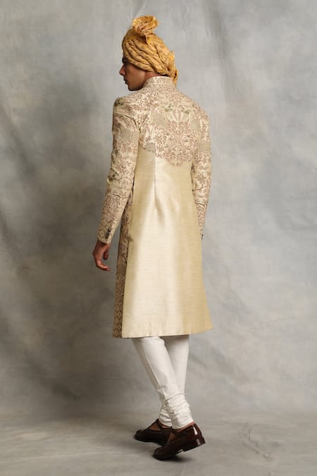 Beige sherwani with floral embroidered motifs & mandarin collar. Paired with kurta, pyjama.