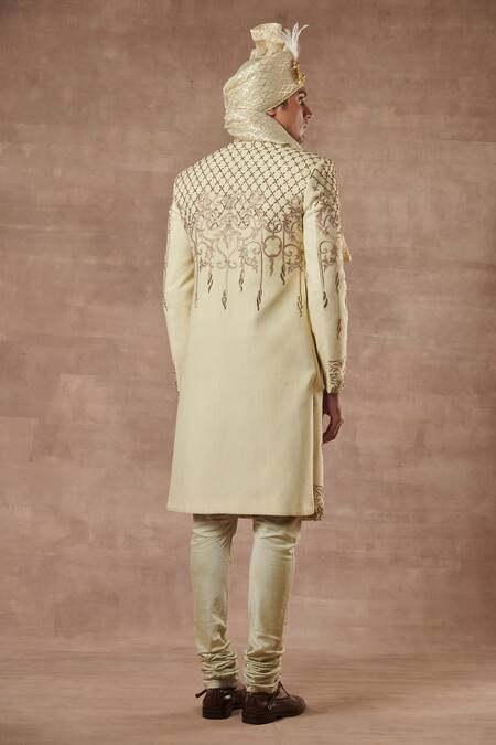 Mint green sherwani with floral embroidered motifs & mandarin collar. Paired with kurta & pyjama.