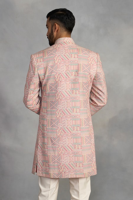 Dusty pink sherwani featuring intricate patterns and button closure. Paired with matching trousers.