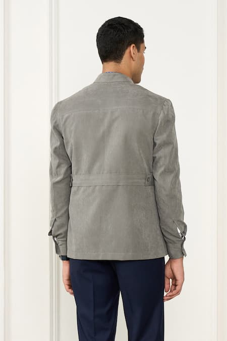 Grey shacket in suede fabric featuring a button closure and side pockets