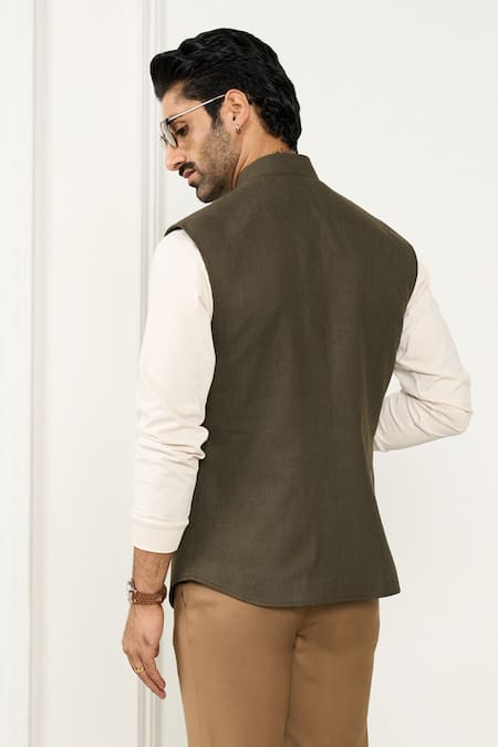 Green vest made from 100% linen featuring a button-down front and a chest pocket