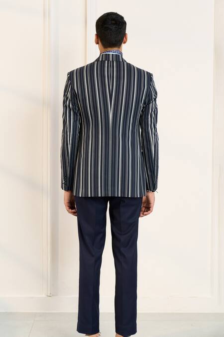 Blue Polyester, Cotton, Viscose Striped Designer Single Breasted Blazer