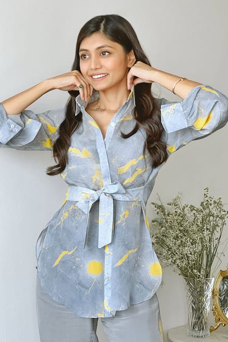 Blue shirt featuring marble print with an attached tie-up belt. Paired with pants that have contrast stripe detailing at the side seams.