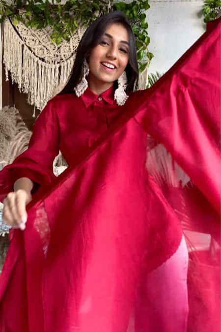 Red Silk, Modal Collared Solid Shirt And Straight Pant Set