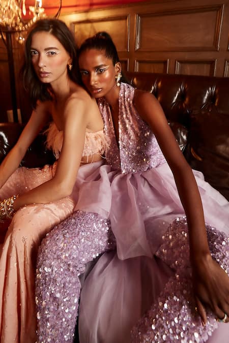 Lilac satin and organza padded peplum top featuring a halter neck and all-over tonal clustered sequin hand embroidery. Paired with straight fit embroidered pants with an organza back fall trail panel.